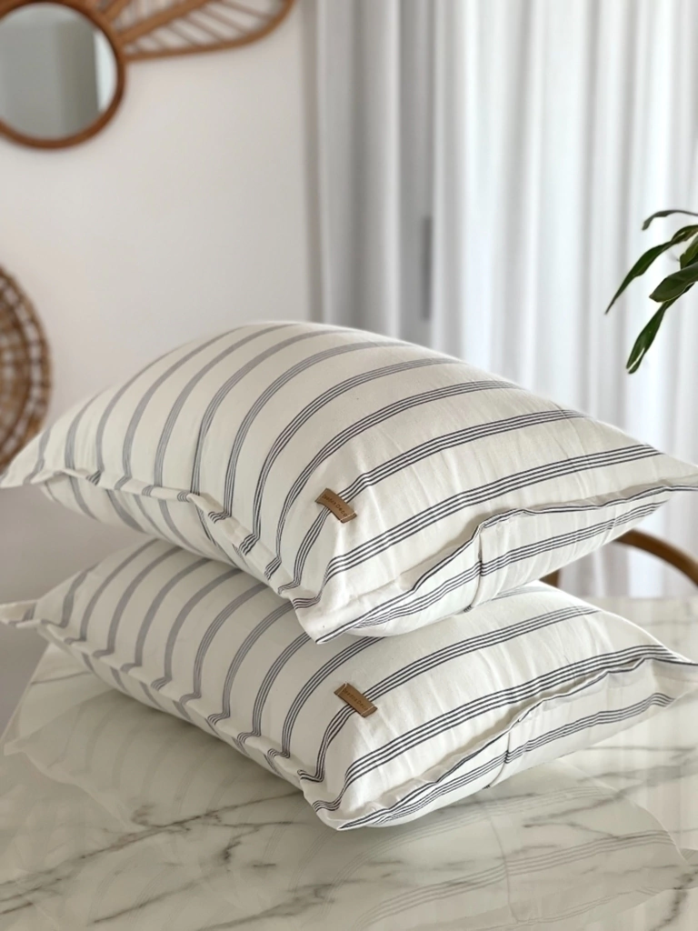 Funda de tusor rayado lavable. Opciones de tonos: triple raya fina camel / triple raya fina gris. NO incluye relleno.